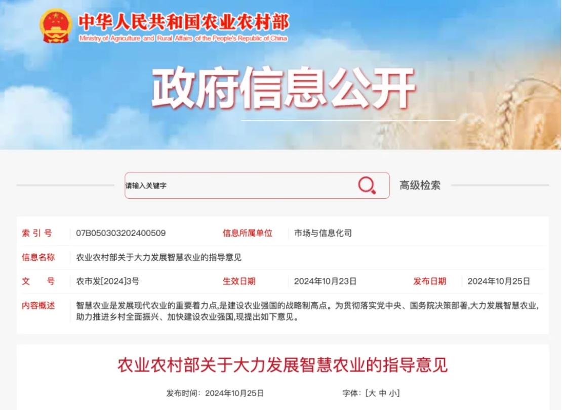 【概要描述】10月25日,農業農村部發布《農業農村部關于大力發展智慧農業的指導意見》及《全國智慧農業行動計劃(2024—2028年)》。明確今后一段時期推進智慧農業的工作思路和重點任務。