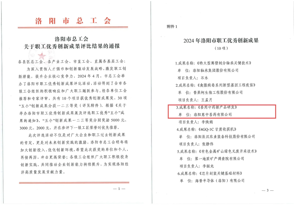 惠中獸藥榮獲2024年洛陽市職工優秀成果獎